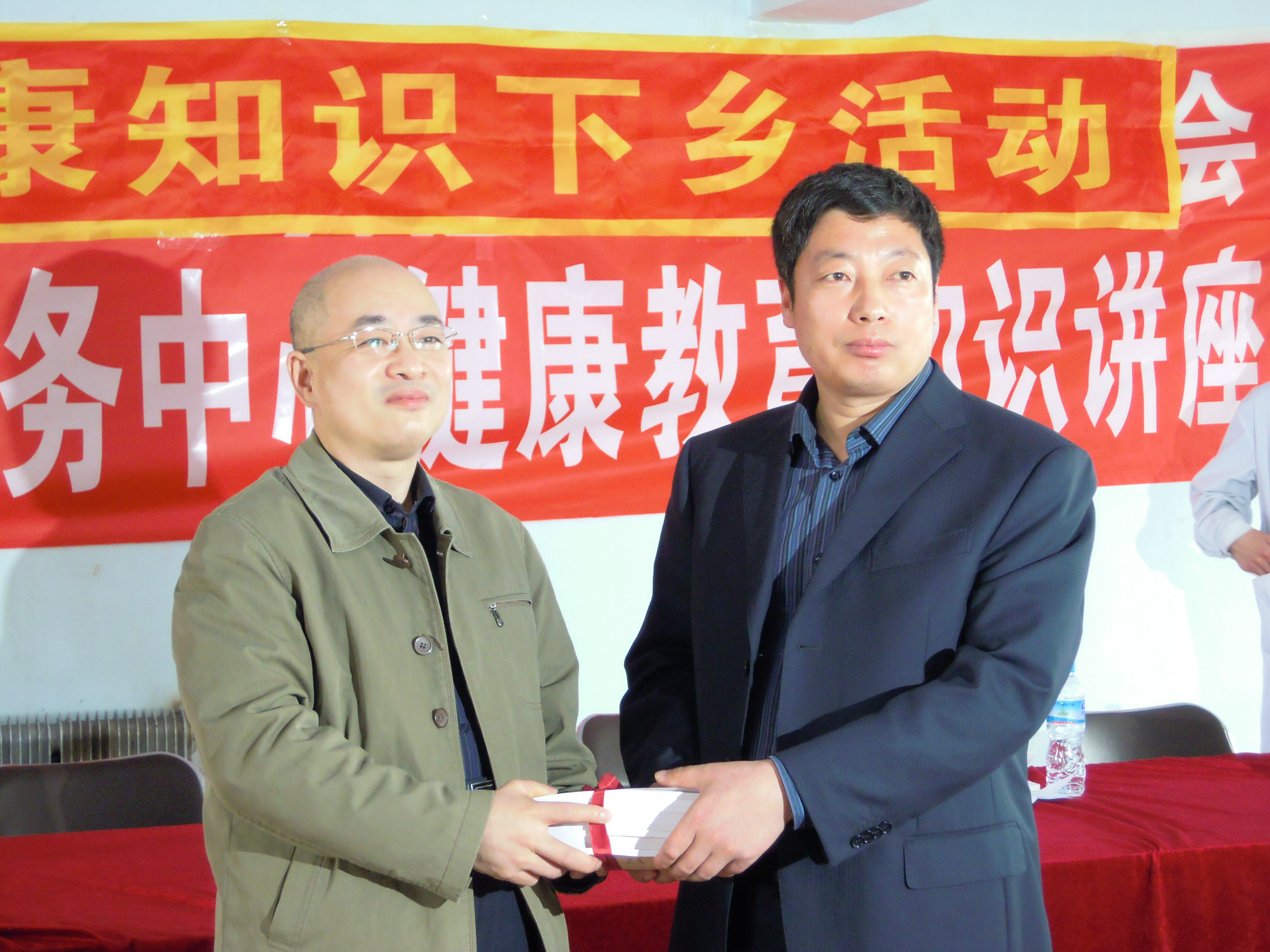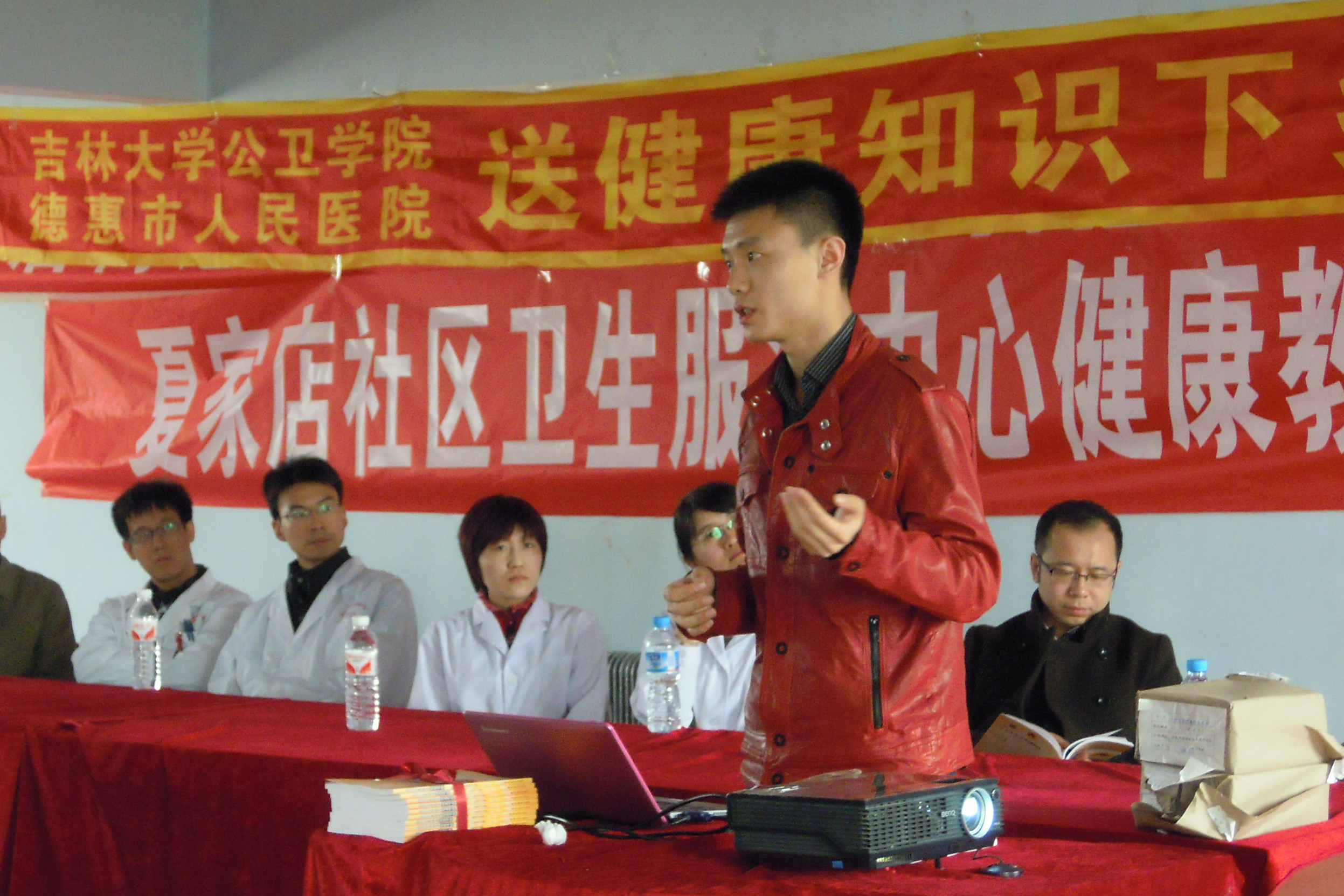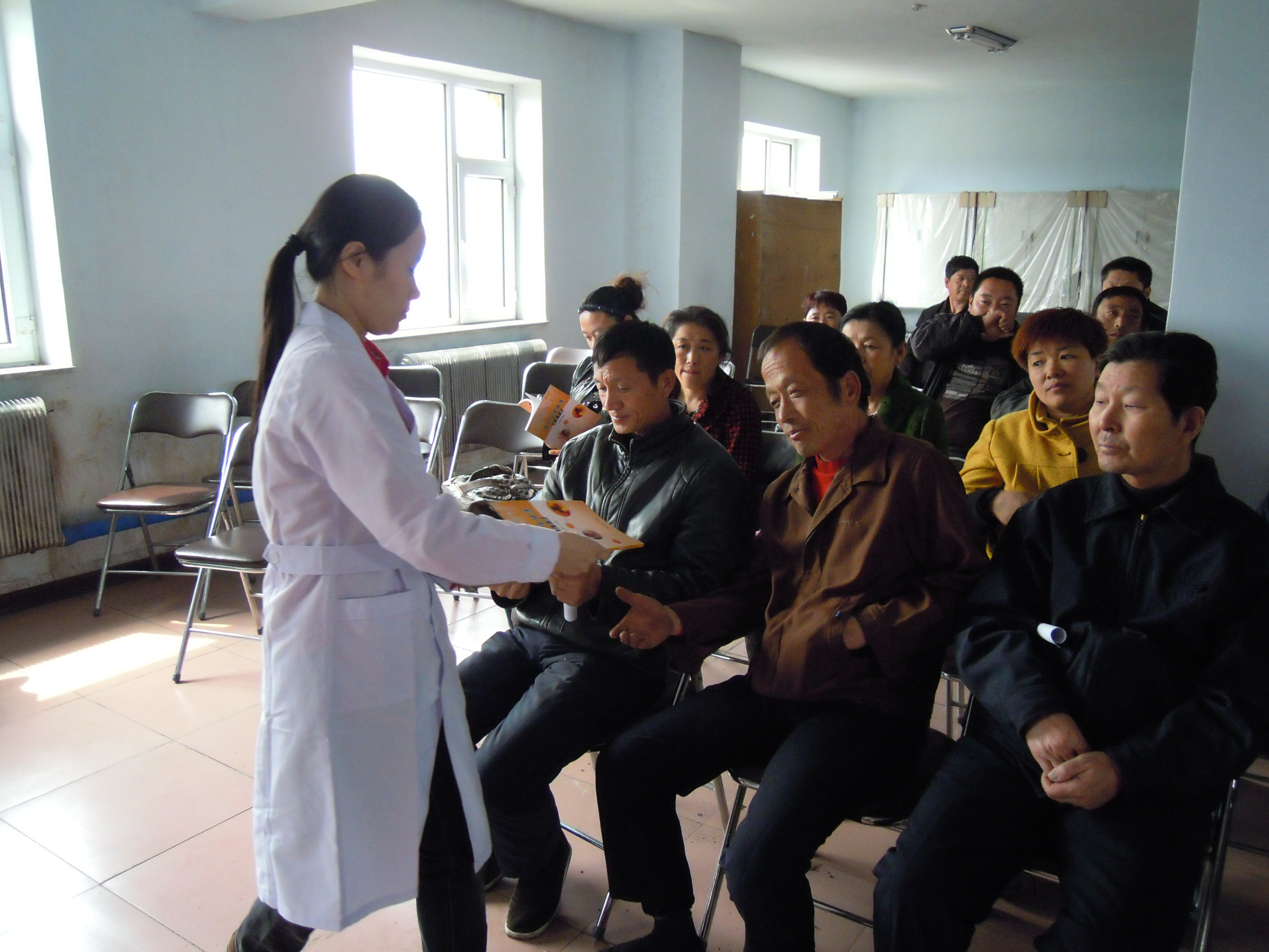 4月21日,由信息检索教研室于双成教授带领《农村家庭健康信息手册》编写团队,来到德惠市夏家店镇,为当地基层医务人员和农民朋友开展送健康知识活动。主要内容是贴近当地百姓生活的健康知识系列讲座:吉林大学第一医院心内科优秀青年医生杨洋(本书副主编)的“高血压的防与治”、七年制学生钱磊的“狗咬伤的处理”、七年制学生贾海燕的“刀割伤的紧急处理”、医药信息专业研究生于跃的“如何通过互联网获取医学知识信息”,最后,德惠市人民医院优秀外科医生尹志(本书副主编)结合本书内容做了阅读指导。每个讲座短小易懂、图文并茂、生动活泼,赢得阵阵掌声。之后,在热烈掌声中,由编者向夏家店镇卫生院领导和现场听众赠书。