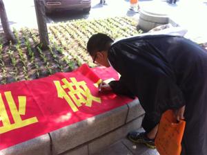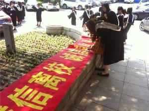 办公楼前集合拍摄集体毕业照,同时在“诚信离校、诚信择业,做一个诚心的人”条幅上依次签名,以此承诺对自己的未来负责,以诚信约束自身行为,践行青春医者路。