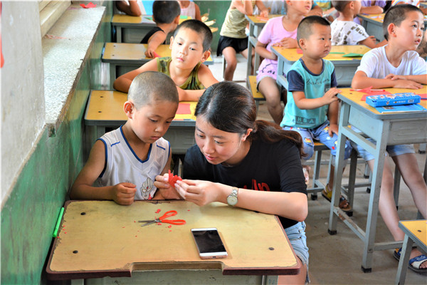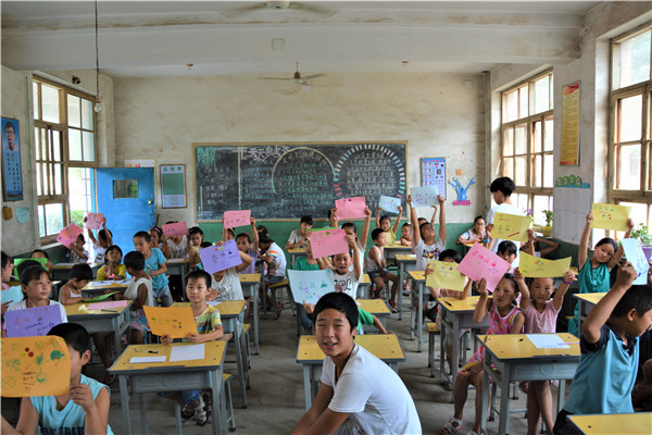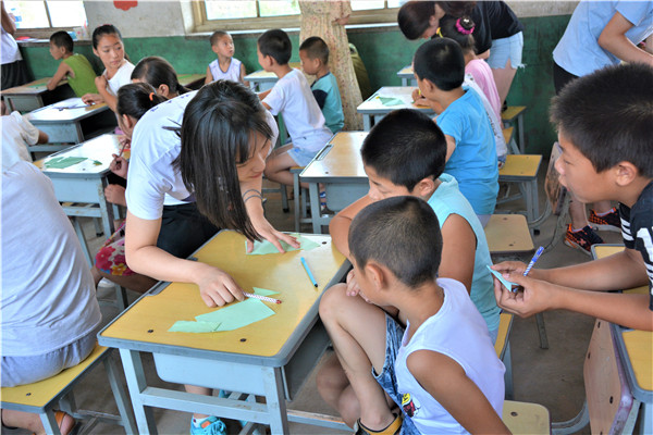 下午的教学活动中,志愿者通过启发的方式,鼓励小朋友们给父母写一封信,表达自己对他们的感恩与爱。大部分小朋友很快就开始动笔,刷刷地在纸上写着,但也有少数小朋友抓耳挠腮,志愿者和他们进行了进一步交流,发现这些小朋友的父母大多离开村子,到大城市去打工以贴补家用,像我们在新闻中了解到的外地务工人员一样,一年回家的次数屈指可数。这些“留守儿童”对他们父母既充满了思念,又委屈于没有父母的时时陪伴,有的小朋友的泪珠还打湿了稿纸,让志愿者们的心难过地揪在了一起。对这些孩子,是既心疼,又无奈。书信课的最后,志愿者向表现出色的孩子赠送了吉林大学医学部的明信片,并向他们介绍白求恩医学部的魅力,鼓励他们好好学习,考上理想的大学。