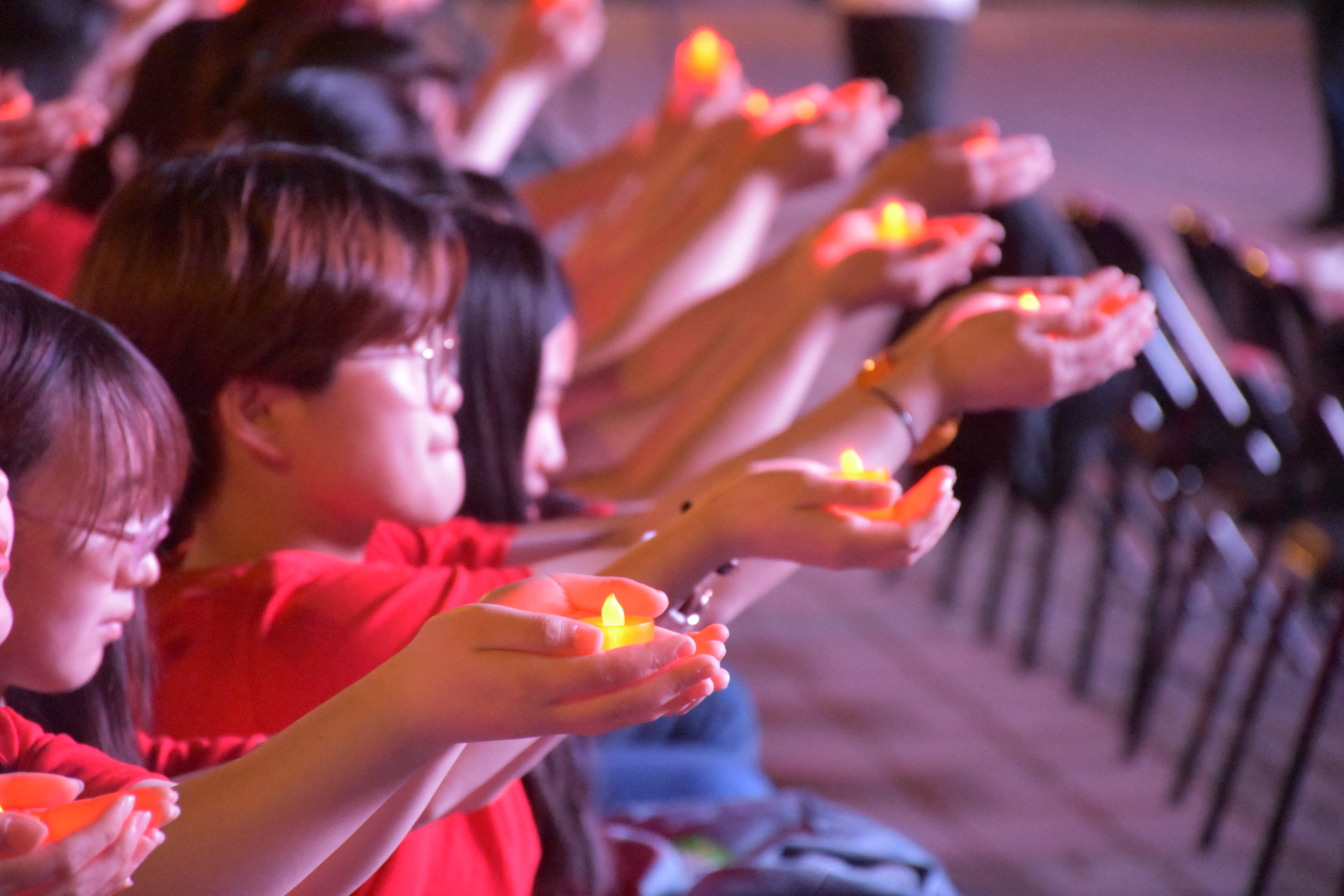 2017级全体学生身穿红色衣服,将手中的蜡烛举过头顶,向艾滋病感染逝去者表达沉重的悼念。