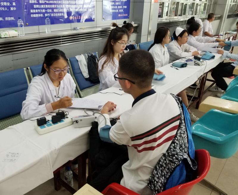 32名迎新体检志愿者的帮助下,新生在中心校区校医院进行了入学体检。