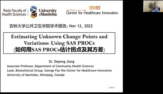 In order to improve the statistical analysis ability of students and promote the development of the discipline of the college, it is funded by the school-level high-end project of the International Cooperation and Exchange Department of the college. On November 12, 2022, the college specially invited Professor Jiang Depeng, Department of Public Health, University of Manitoba, Canada, to give an online lecture on advanced biostatistical methods. Professor Jiang is now a tenured professor in the Department of Public Health of the University of Manitoba, Canada, and also the head of the Statistical Advisory Group of the University of Manitoba. He is also a specially invited expert of the "Chunhui Program" of the Ministry of Education of China. The lecture was hosted by Kou Changgui, the vice president of the College of Public Health, and more than 50 graduate students and relevant teachers of the College participated in the study.